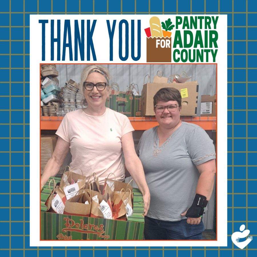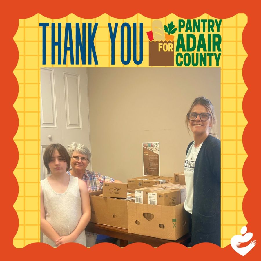 A huge thank you to the Adair County Food Pantry for their recent donation of food bags and soap for individuals experiencing homelessness.